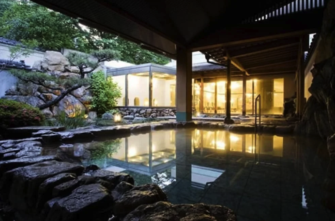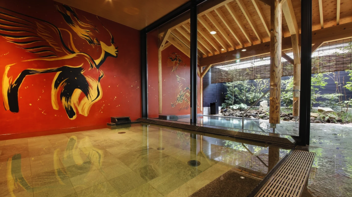 관내에는 길가의 온천수를 끌어온 천연온천 대욕장 대욕장도 있다. 일본의 전통 색채를 도입한 아트 미장 벽과 거기에 그려진 대형 벽화는 압권이다. 정원을 바라보며 목욕할 수 있는 노천탕도 있어 바깥 바람을 맞으며 느긋하게 힐링할 수 있다.