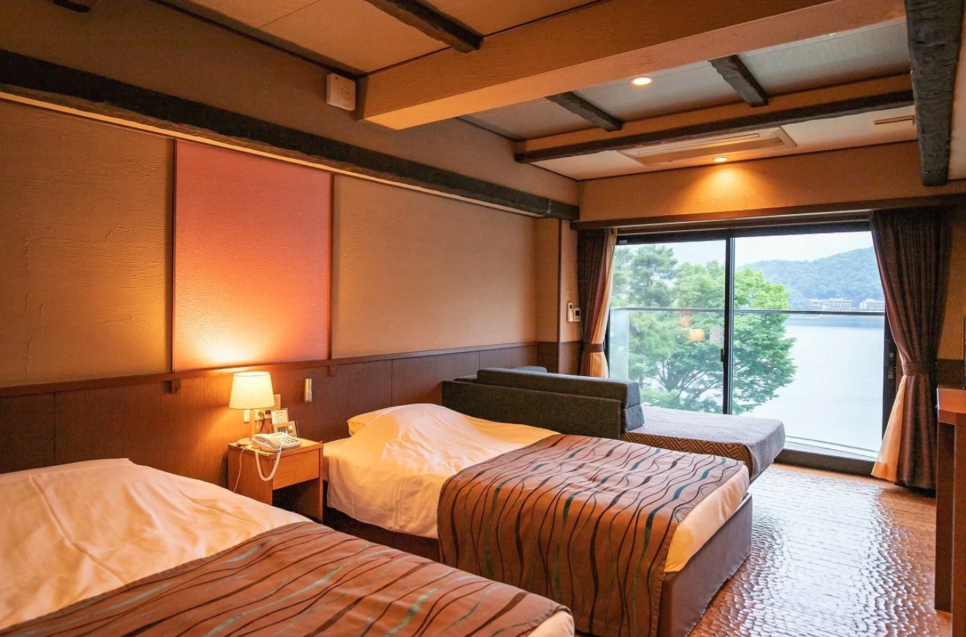 객실은 후지산 또는 가와구치코의 전망을 즐길 수 있는 노천탕이 딸린 객실을 추천한다. 후지산 쪽 객실은 계절과 시간대에 따라 표정을 바꾸는 자연의 경치를, 가와구치코 쪽 객실은 밤이 되면 호반의 네온사인이 호숫가에 비춰져 환상적인 분위기를 즐길 수 있다.
