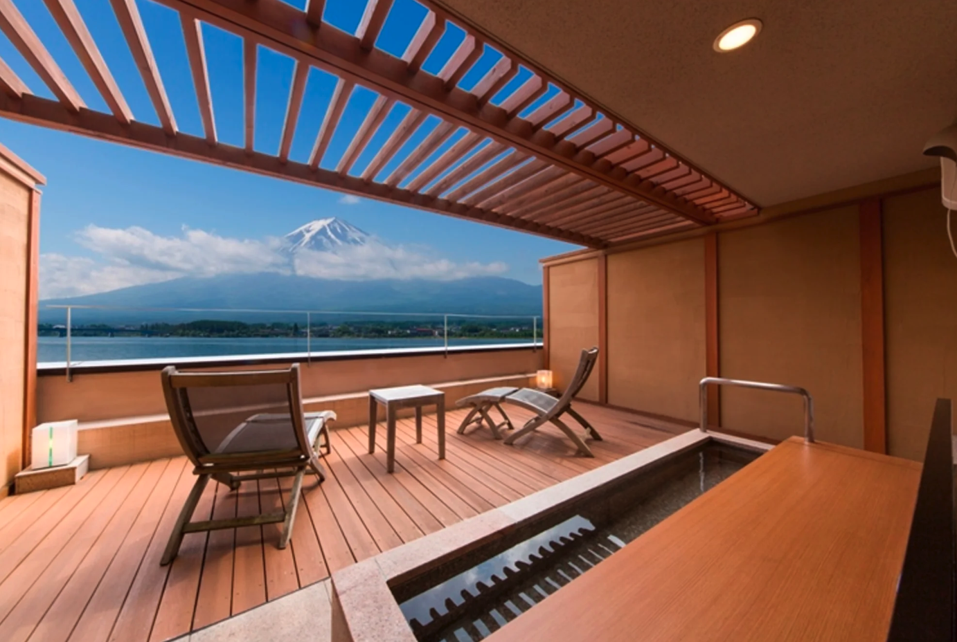 럭셔리한 공간에서 둘만의 여유로운 시간을 보낼 수 있을 것 같다. 노천탕이 딸린 특별실에는 가와구치코 온천을 즐길 수 있는 전망 노천탕도 있다.